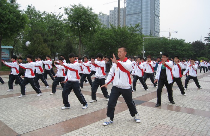 陕铁院学生身着校服,队列整齐,吸引了不少市民关注 4月20日、21日清晨,渭南市的中心广场聚集了上千名太极爱好者,集体演练简化24式太极拳。学院道桥工程系太极协会100余学生在指导老师的带领下,参与了此次盛会。伴随着悠扬的音乐,上千人缓缓地打出了一招一式,整个表演场面极其壮观,吸引了众多市民驻足观看,并赢得了现场市民的称赞。此次活动参加人数达1000人,最大年龄近80岁,最小年龄为18岁。(孙明娣、张幸)