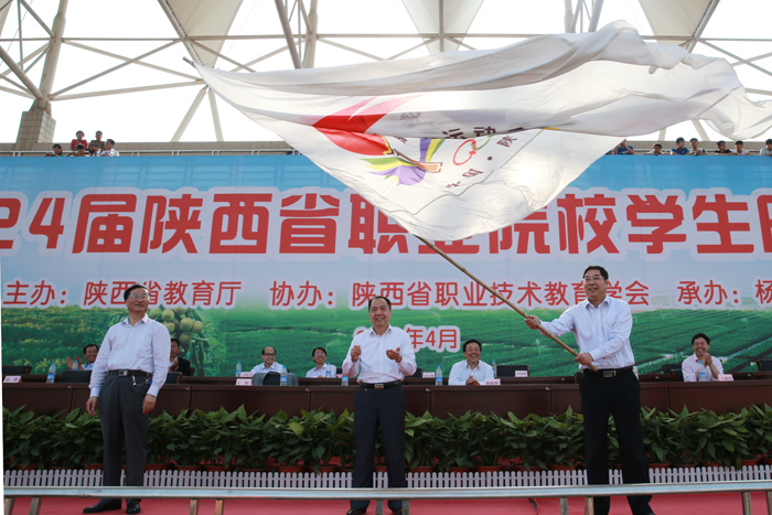 4月27日,第24届陕西省职业院校学生田径运动会在杨凌职业技术学院落下帷幕。当天下午还举行了会旗交接仪式,作为2014年第25届陕西省职业院校学生田径运动会承办方,学院党委书记王晖代表学院,从陕西省教育厅职业教育与成人教育处处长李明富手中,接过了陕西省职业院校学生田径运动会会旗。届时,陕西省近90所职业院校的近千名学生运动员将齐聚陕铁院新校区展开竞技比赛。(毛华东)