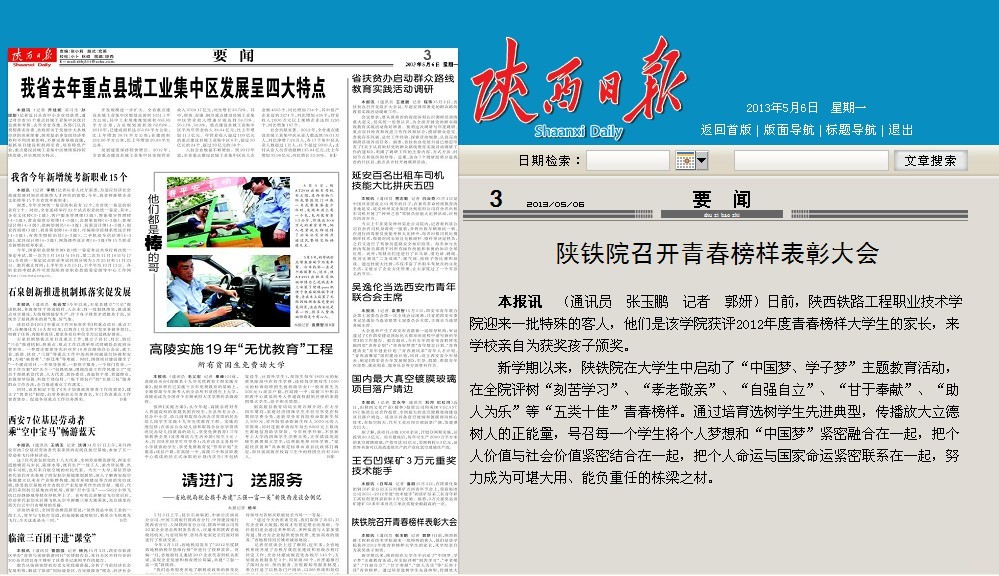 2013年5月6日陕西日报第3版题:陕铁院召开青春榜样表彰大会