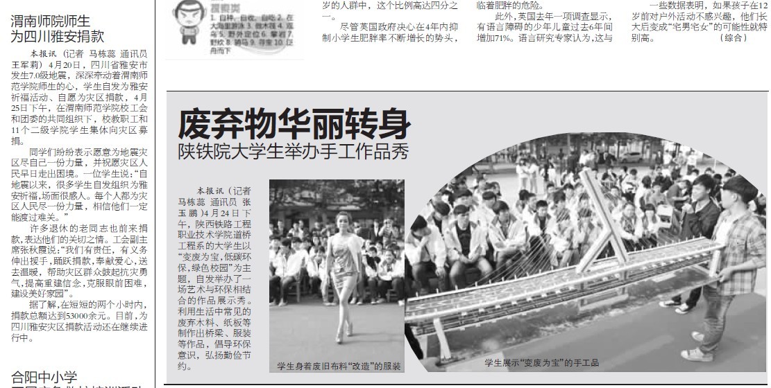 2013年5月7日渭南晚报第14版题:废弃物华丽转身 陕铁院大学生举办手工作品秀