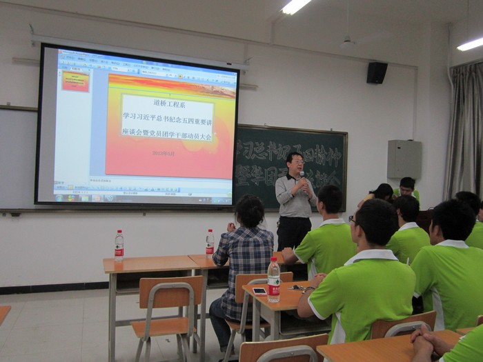 ◆道桥系召开学习习近平总书记纪念“五四”运动讲话暨党员团学干部倡议动员大会。5月14日、15日晚,道桥工程系在分别在临渭校区和高新校区召开了学习习近平总书记纪念“五四”运动94周年的重要讲话暨团学干部、学生党员、积极分子倡议动员大会,道桥工程系党总支书记郗春荣老师、部分学管人员及全体学生党员、入党积极分子和团学干部等300余人参加了大会。