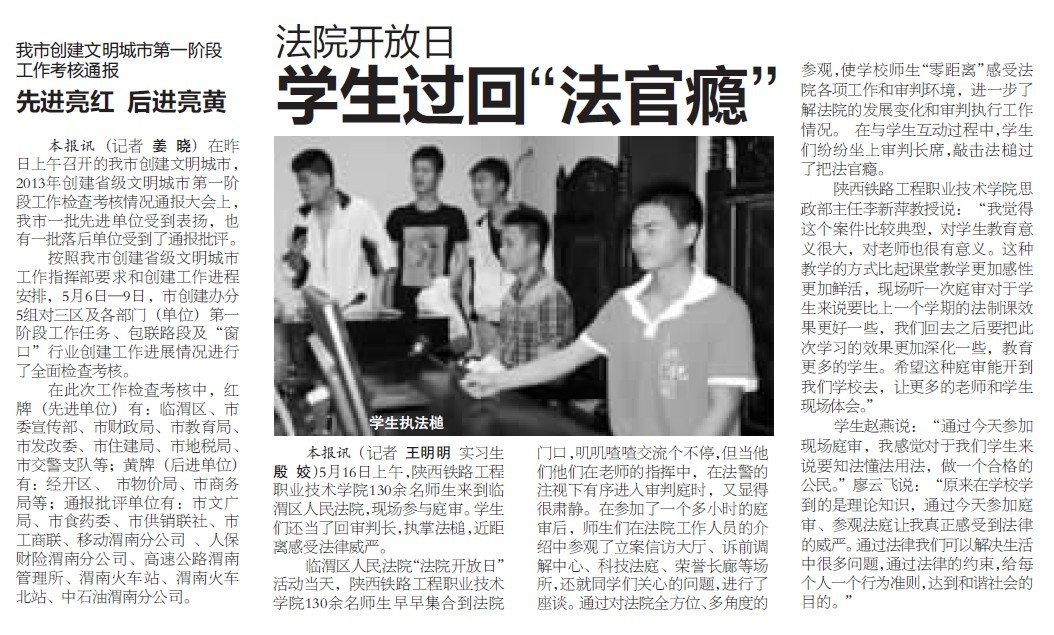 2013年5月17日渭南晚报第3版题:法院开放日 学生过回“法官瘾”