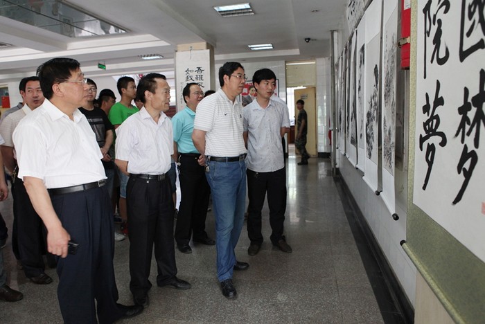 5月20日,由学院党委宣传部、院团委共同举办的第四届“希望杯”师生书画展(暨首届艺术教育活动月活动之一)在B楼大厅开幕。学院党委书记王晖,党委副书记车绪武,党委副书记、纪委书记杨云峰,副院长王闯、焦胜军亲临现场观摩指导。
