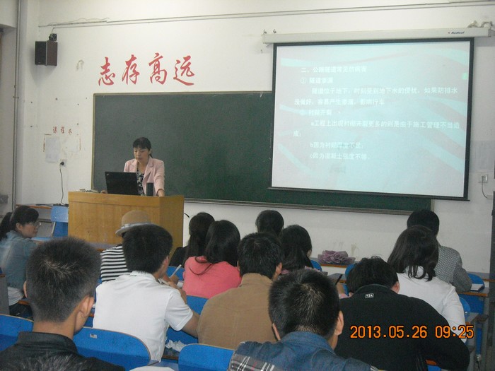 讲座现场 5月26日上午,道桥工程系邀请中铁二十局中心试验室主任王建利为2010级材料工程技术专业学生和部分教师作了“隧道工程试验与检测”的专题讲座。 王建利从公路隧道和铁路隧道常见的工程质量问题入手,对公路隧道和铁路隧道试验与检测内容进行了讲解,并强调了试验与检测过程中的一些注意事项,加深了大家对隧道试验与检测方面的理论认识。王主任以其丰富的现场试验与检测经验,赢得了在场师生的阵阵掌声,受到了大家的热烈欢迎。(彭磊)