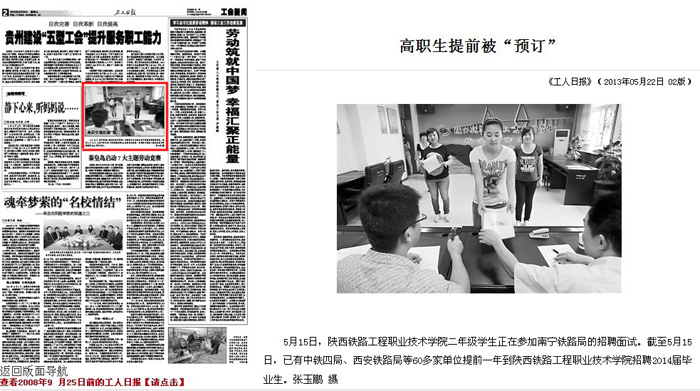 5月22日,《工人日报》第2版以“高职生提前被‘预订’”为题报道陕铁院
