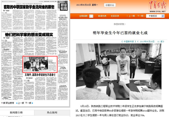 5月20日,《中国青年报》职业教育版以“陕西铁职院:明年毕业生今年已签约就业七成”为题报道陕铁院