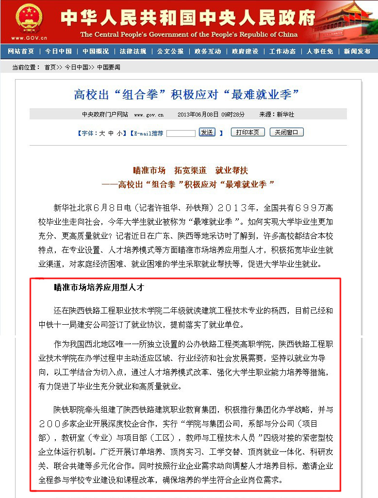 6月8日,中华人民共和国中央人民政府门户网站“中国要闻”栏目以“瞄准市场 拓宽渠道 就业帮扶——高校出‘组合拳’积极应对‘最难就业季’”为题,在文章头条位置处,对陕西铁路工程职业技术学院瞄准市场培养应用型人才、毕业生实现高质量充分就业进行了报道。