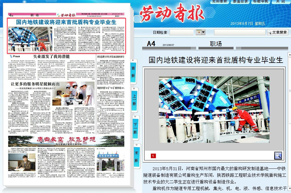 2013年6月7日劳动者报第4版题:国内地铁建设将迎来首批盾构专业毕业生