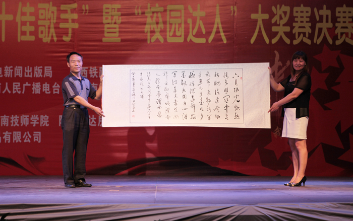 在三个小时的比赛时间里,参赛选手们用精湛的唱功和表演,充分展现了当代大学生的青春活力和勇于追求梦想的精神风貌,为观众们带来了一场精彩绝伦的视听盛宴。最终,来自渭南师范学院的乔丹凭借一曲《亲爱的小孩》夺得“十佳歌手”大赛第一名。陕铁院在本次大赛中成绩斐然,参赛的4组选手成功晋级“十佳歌手”大赛前十强,包揽“校园达人”比赛第一、二名,学院荣获大赛优秀组织奖。与会领导嘉宾为获奖单位和选手颁发了奖牌和荣誉证书。诺亚舟渭南地区分公司董事长还向学院赠送了书法作品,衷心祝愿学院各项事业蒸蒸日上。