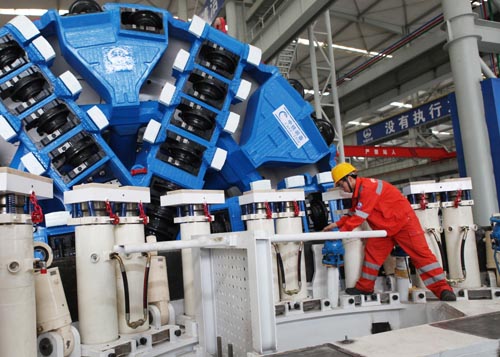 盾构生产车间里安装中盾注浆管道阀门。张玉鹏 摄