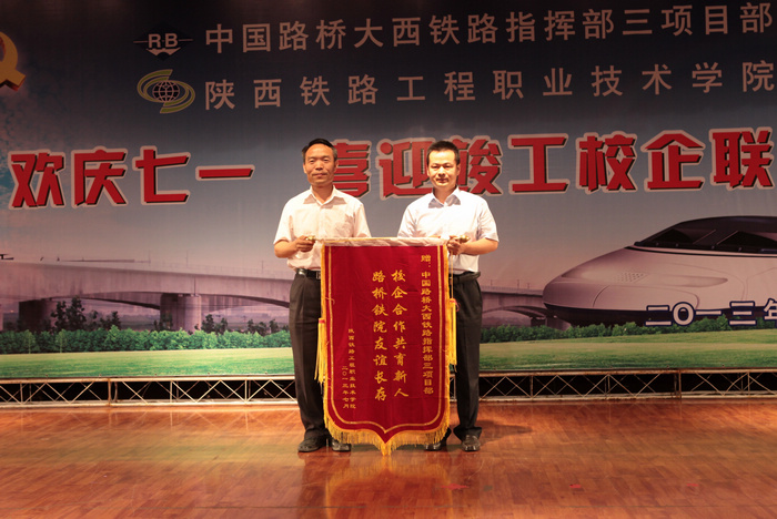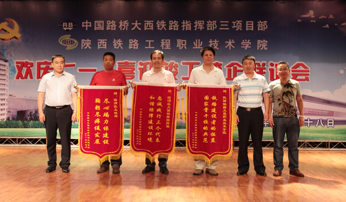车绪武在会上致辞,对中国路桥大西铁路指挥部三项目部长期以来对学院的支持表示感谢,并代表学院向项目部赠送了题有“校企合作共育新人,路桥铁院友谊长存”的锦旗。王闯在会上代表学院接受了项目部赠送的题有“铁路建设者的摇篮,国家骨干校的典范”的锦旗。