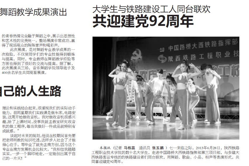 2013年7月2日渭南晚报第14版题:大学生与铁路建设工人同台联欢 共迎建党92周年