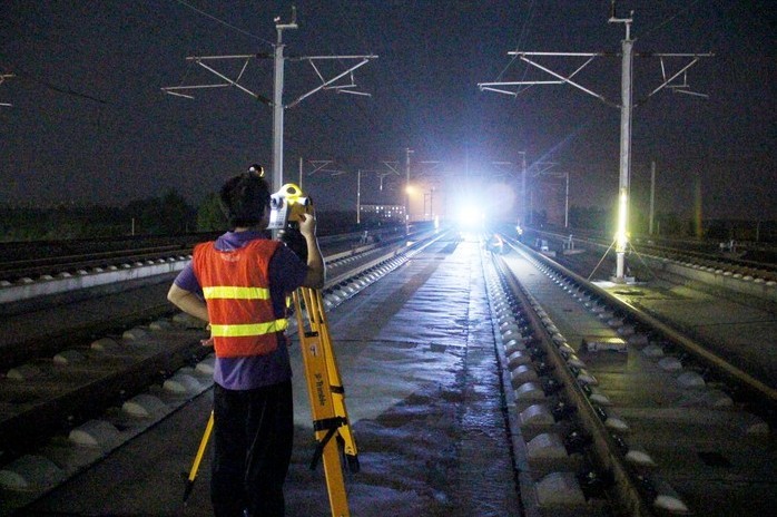 利用“天窗”时间,夜间上线进行高铁CPIII测量作业 近日,测绘工程系3名教师和2011级40名学生,圆满完成中铁一局京石铁路客运专线运行期间的标段高程控制网复测任务。技术服务期间,学院师生齐心协力,克服了夜间连续上线作业、工期紧等困难,顺利完成线下350公里二等水准测量和线上北京西站至保定东站150公里CPIII控制网高程测量以及段内设计单位提供的81个二等水准点、7个深埋水准点、1个水准基岩点的复测工作。(曾庆伟)