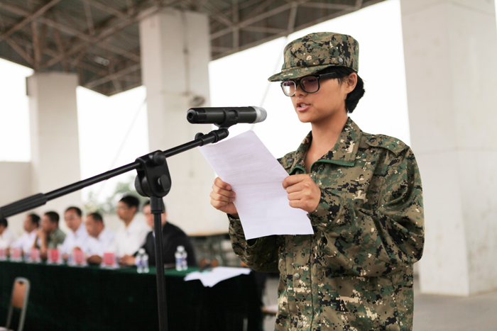 新生代表在会上做了发言。王闯宣读了学院关于表彰军训先进连队、优秀教官和学员的决定,焦胜军宣读了学院关于对二本线以上新生奖励表彰的决定。受到表彰的集体和个人上台领取了奖牌和荣誉证书。