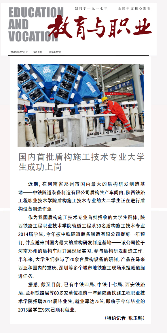 2013年《教育与职业》杂志第19期题:国内首批盾构施工技术专业大学生成功上岗