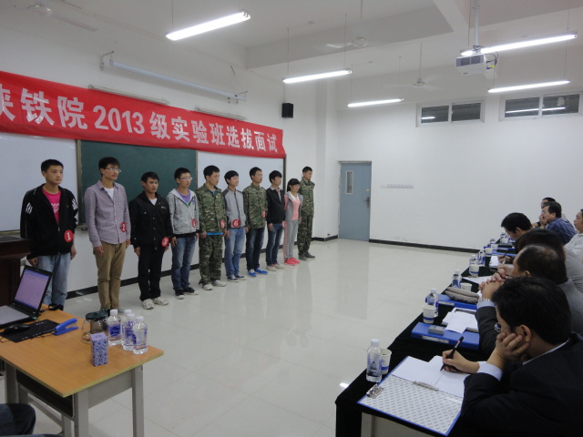 选拔面试现场 近期,学院在2013级新生中开展了实验班学员选拔工作。经过前期的宣讲、面试等层层选拔,最终有70名2013级新生进入实验班。实验班分两个班,每班35人,分别由铁道工程系和道桥工程系代管。开设实验班,旨在强化培养“懂设计、精施工、能管理”,适应我国经济社会发展需要的“一专多能”技术技能型专门人才。(李晓斌/文 黄新静/图)