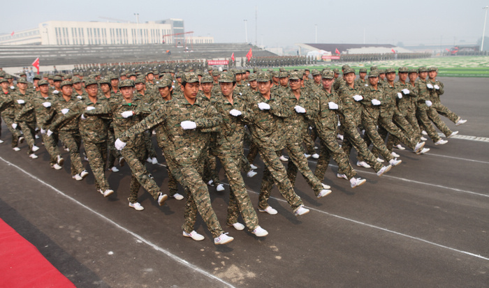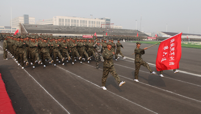 军训连队依次从主席台前走过,接受领导检阅
