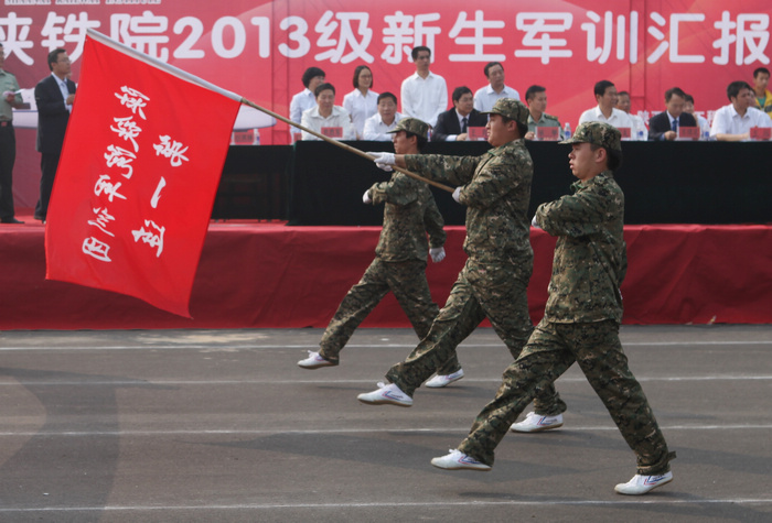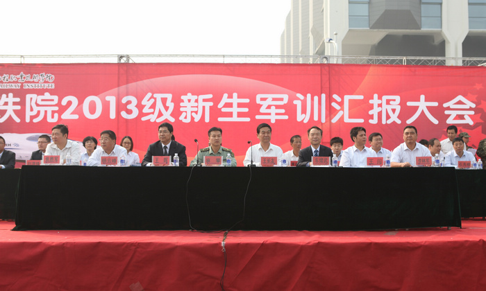 10月4日上午,陕西铁路工程职业技术学院高新校区2013级新生军训阅兵暨总结表彰大会在运动场隆重举行。学院党委书记王晖,院长王长友,党委副书记车绪武,党委副书记、纪委书记杨云峰,副院长王闯、焦胜军、李林军,中国人民解放军63785部队技工训练队政治教导员麻攀出席了大会,学院相关职能部门及系部负责人,承担新生军训任务的军训教官及全体2013级新生参加了大会。大会由车绪武主持。