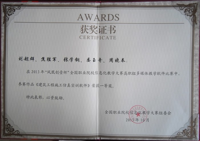 10月21日,2013年全国职业院校信息化教学大赛决赛结束,陕铁院刘超群、焦胜军、张学钢、委玉奇、周晓奉等教师主持的《建筑工程施工仿真实训软件》获得高职组多媒体教学软件比赛一等奖。