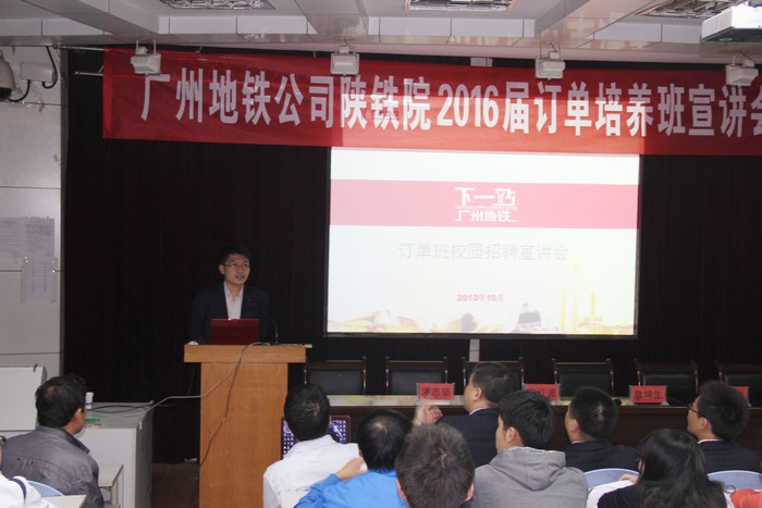 10月18日,广州地下铁道公司经理詹坤生一行6人来院就组建2016届订单班进行了考察交流,分别在学院临渭校区和高新校区召开了“广州地铁公司陕铁院2016届订单班宣讲会”,介绍了广州地下铁道公司的发展情况,对组建订单班事宜向学生进行了说明,并对报名学生进行了考试和面试。