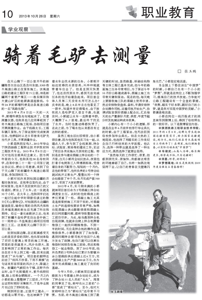 @陕西铁路工程职业技术学院:2011年的4月8日,这群大学生赴祖国边疆顶岗实习,助力国家边疆建设,到今天,他们已经在奇木高速项目工作两年了!在那里,他们挥洒青春,以实际行动共筑“中国梦”!