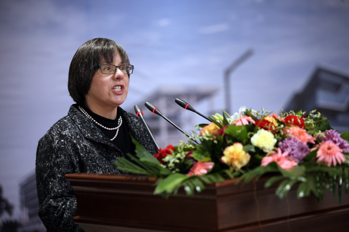 外宾代表,美国大学理事会理事、米德塞克斯社区大学国际教育学院院长杜雅琪女士在会上作了讲话。她代表米德塞克斯社区大学,向陕铁院40年校庆表示最热烈的祝贺!她表示,中国的职业教育方兴未艾,正在蓬勃发展。美国的社区学院从创建至今已有一百多年的历史,也在不断的发展与完善。世界的教育需要合作交流,陕铁院发展日新月异,硕果累累,是一匹职业教育的黑马。米德塞克斯社区大学很愿意跟英姿勃发、团结进取的陕铁院人合作,在专业发展、课程交流、教师交流等方面相互借鉴与支持,共同探索出支持学生成才的合作之路。相信两校的合作必有丰硕成果,必将促进两校的进步与发展,必将培养出更多的优秀毕业生!