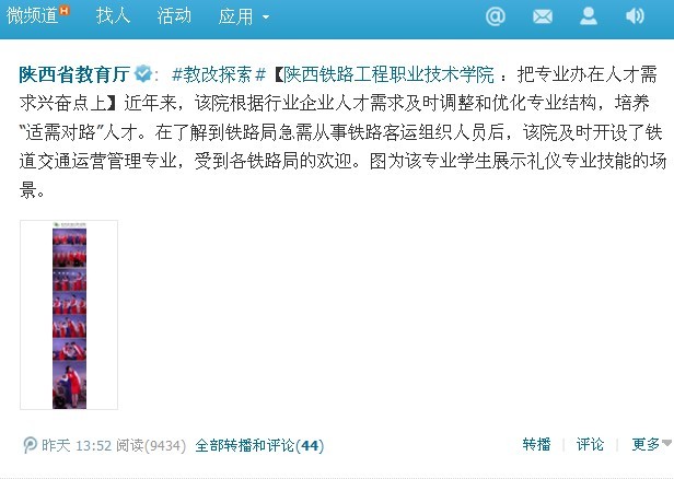 2013年11月11日陕西省教育厅官方微博题:陕西铁路工程职业技术学院 :把专业办在人才需求兴奋点上