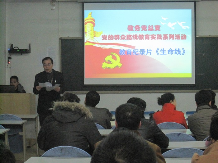 ◆教务党总支组织党员观看党的群众路线教育实践活动纪录片。11月22日教务党总支组织全体党员观看了党的群众路线教育实践活动纪录片《生命线》,并对前期开展群众路线教育实践活动情况进行了总结,部署安排了下一步活动开展工作。