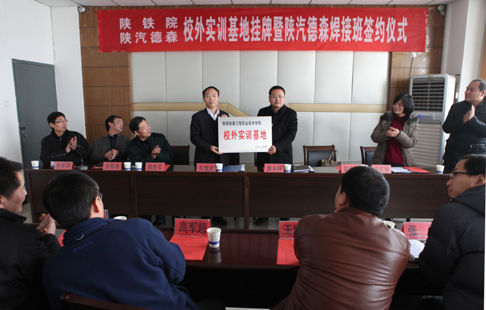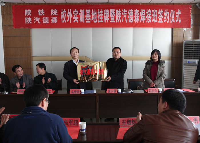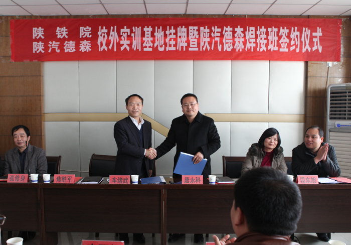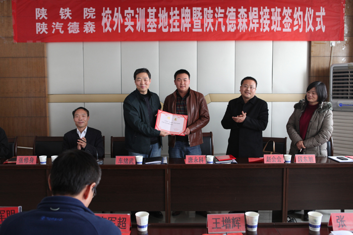 12月17日,陕铁院举行了“陕汽德森焊接班”签约暨校外实训基地授牌仪式。学院党委副书记车绪武代表学院授予西安德森新能源装备有限公司“校外实训基地”牌匾,聘任唐永科、陈飞绸、王增辉三位企业专业技术人员为机电工程系兼职教师,学院副院长焦胜军为其颁发了聘书。西安德森新能源装备有限公司总经理、党支部书记唐永科代表企业授予陕铁院“人才培养基地”牌匾,授予焊接3131班“陕汽德森焊接班”牌匾。