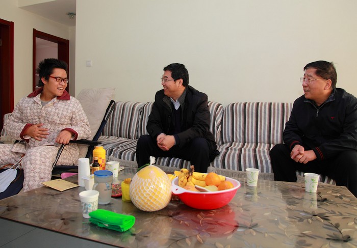 12月18日,陕西铁路工程职业技术学院党委书记王晖、党委副书记兼工会主席杨云峰专程来到刚做完手术在家养病的青年教师吕秋鸿家中,亲切的询问了他的病情及健康恢复情况,并送上慰问金表达了组织的关怀和祝福。随后。院领导又到高新校区铁道工程系和临渭校区图书馆分别看望和慰问了两名病、困青年女教职工,祝愿她们依靠组织、战胜病困、愉快工作、幸福生活。(季露) 王晖和杨云峰与青年教师吕秋鸿在家中亲切交谈 杨云峰看望慰问青年女教师王婷茹