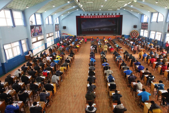 12月22日,陕铁院临渭校区文体中心一排排桌椅排列整体,学生们聚精会神答题,这里正在进行陕铁院2013-2014学年第一学期期末考试。文体中心成为一次容纳300人同时考试的特大考场,这是陕铁院规范考试管理、强化考风考纪的新举措。