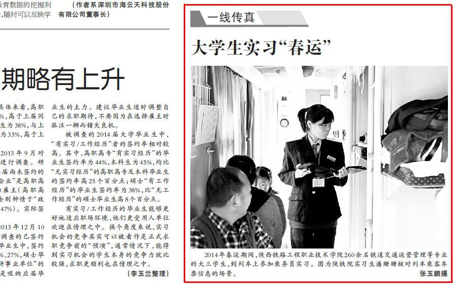 1月30日,《光明日报》第15版以“大学生实习‘春运’”为题,对陕西铁路工程职业技术学院260余名大三学生服务铁路春运进行了报道。1月27日的《中国青年报》也以“高职生助力春运”为题,对这一消息进行了报道。此外,《华商报》、《陕西科技报》、光明网、新华网、中国网、中国大学生在线、西部网、陕西省教育厅官方微博、《华商报今日渭南》等10余家中省主流媒体也分别给予报道。现将全文转载如下: