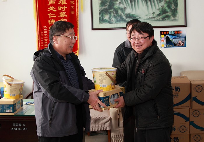 2月10日,学院党委副书记、工会主席杨云峰在校园内,专程走访、看望了学院各专业系部和部分职能部门在岗加班工作的70余位教职工,对大家为把陕铁院早日建成国家骨干示范校而放弃休假、奋力冲刺的拼搏精神表示了由衷的敬意和诚挚的慰问。(季露) 杨云峰为学院示范办加班教职工发放慰问品 杨云峰为学院轨道工程系加班教师发放慰问品