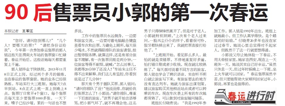 “您好,请问您到哪儿?”“几个人?要哪天的票?”“请把身份证给我”, 今年第一次参加春运售票的郭入铭这些天在渭南火车站的售票窗口忙碌着,春运开始后,这些话她每天都要重复上千遍。