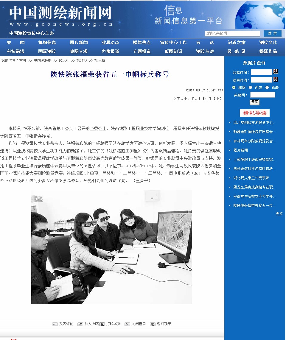2014年第17期中国测绘报、中国测绘新闻网题:陕铁院张福荣获省五一巾帼标兵称号