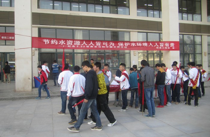◆铁工系举行世界水日中国水周签名宣传活动。在第二十二个“世界水日”、第二十七个“中国水周”来临之际,3月20日下午,铁道工程系在新校区餐厅门前举行了签名宣传活动,通过宣传横幅、展板、发放节水宣传单等形式,向师生们宣传、介绍“世界水日”、“中国水周”及我国水资源、渭南城区自来水供应等情况,呼吁在校大学生增强节水意识,保护有限的淡水资源。(毛俊杰)