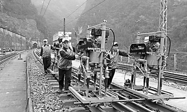3月19日,西安铁路局安康工务段职工、陕西铁路工程职业技术学院毕业生霍力(前左)和同事一道,在襄渝铁路巴山站内开展小机群捣固作业。近年来,已有近200名陕铁职院毕业生就职于安康工务段,在管内线桥设备养护维修第一线发挥着生力军的作用,受到企业领导的好评。 蒋平江摄