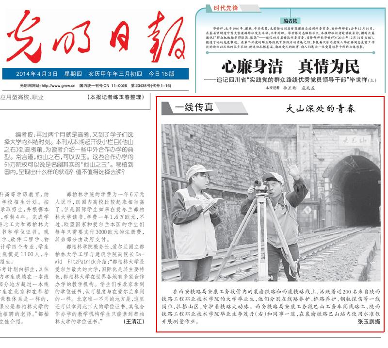 4月3日,《光明日报》第15版以“大山深处的青春”为题,文图并茂地报道了陕西铁路工程职业技术学院毕业生在铁路养护一线挥洒青春的优秀事迹。近期,《光明日报》、《中国青年报》、《中国劳动保障报》、《陕西日报》、《陕西工人报》、新华网陕西频道、西部网等十余家中央和地方媒体以“大山深处的大学生铁路养护人”为题,纷纷对奋战在西安铁路局安康工务段的学院毕业生群体的优秀事迹进行了报道,在社会上引起良好反响。现将全文转载如下: