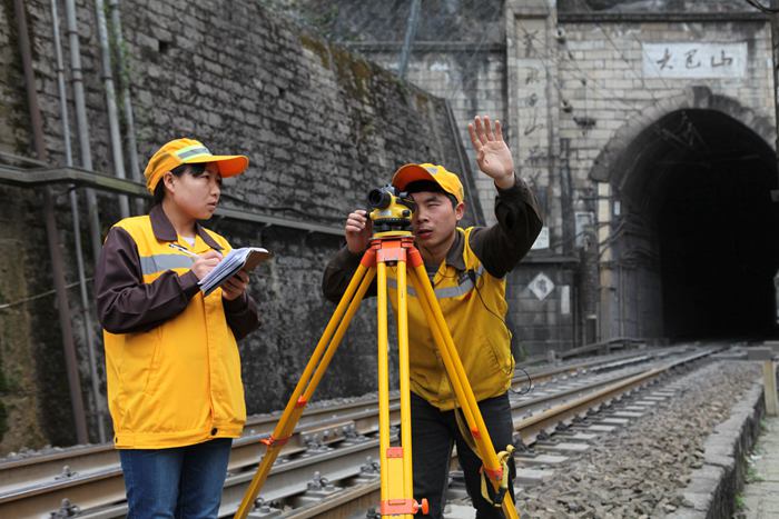 在西安铁路局安康工务段管内的襄渝铁路和西康铁路线上,活跃着近200名来自陕西铁路工程职业技术学院的大学毕业生,他们分别在线路养护、桥路养护、钢轨探伤等一线岗位,扎根山区,守护着铁路大动脉。西安铁路局安康工务段巴山工务车间线路工、陕西铁路工程职业技术学院毕业生李茂丹(右)和同事一道,在襄渝铁路巴山站内使用水准仪开展测量作业。张玉鹏摄