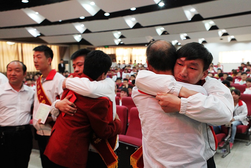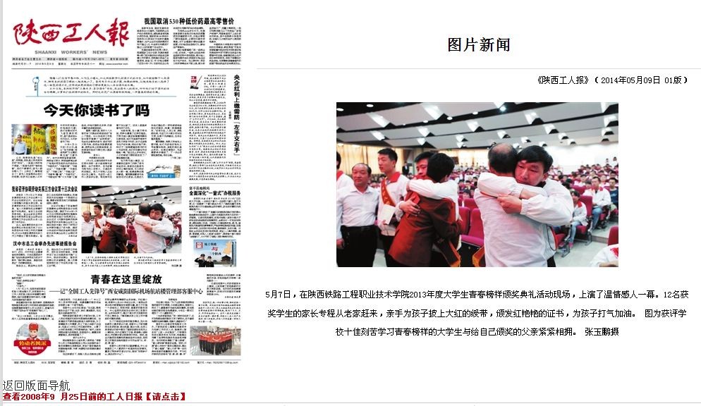 5月7日,在陕西铁路工程职业技术学院2013年度大学生青春榜样颁奖典礼活动现场,上演了温情感人一幕。12名获奖学生的家长专程从老家赶来,亲手为孩子披上大红的绶带,颁发红艳艳的证书,为孩子打气加油。 图为获评学校十佳刻苦学习青春榜样的大学生与给自己颁奖的父亲紧紧相拥。 张玉鹏摄 报纸截图