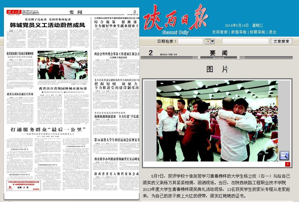 报纸截图 5月7日,获评学校十佳刻苦学习青春榜样的大学生杨立柱(右一)与给自己颁奖的父亲杨万其紧紧相拥,泪洒现场。当日,在陕西铁路工程职业技术学院2013年度大学生青春榜样颁奖典礼活动现场,12名获奖学生的家长专程从老家赶来,为自己的孩子披上大红的绶带,颁发红艳艳的证书。 张玉鹏 本报记者 刘强摄