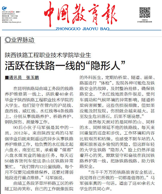 在昆明铁路局曲靖工务段的线路养护维修第一线上,活跃着40余名毕业于陕西铁路工程职业技术学院的大学生。他们坚守在管内的沪昆线、盘西线、威红线、水红线等4条线路上,分别从事线路养护、桥路养护、钢轨探伤、测量等工作。