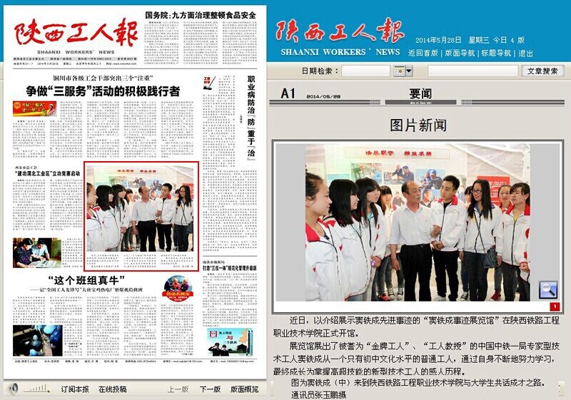 2014年5月28日陕西工人报头版题:窦铁成事迹展览馆在陕铁院开馆