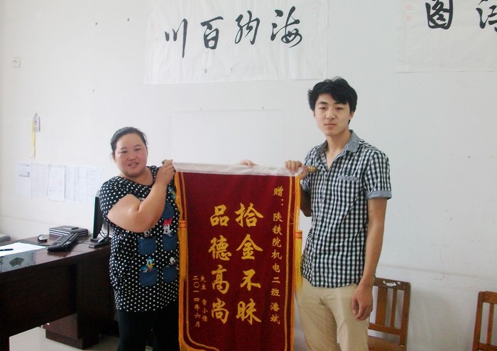 6月20日上午,家住渭南市临渭区的常女士风尘仆仆的赶到陕铁院,把一面锦旗送到了学院机电工程系通号3132班潘斌同学手中,感激之情溢于言表。
