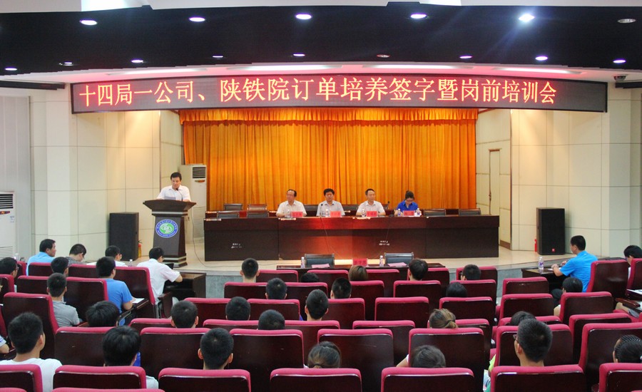 7月9日下午,学院在临渭校区学术报告厅举行陕铁院、中铁十四局一公司订单培养签约仪式暨岗前培训大会,双方签订了定向培养班协议,并揭牌。仪式后,该公司对全体订单班学生进行了岗前培训。党委副书记车绪武,中铁十四局一公司纪委副书记王启高、人力资源部主任肖萍,学院就业中心、学生处、教务处、系部负责人及118名2015届订单班学生出席大会。