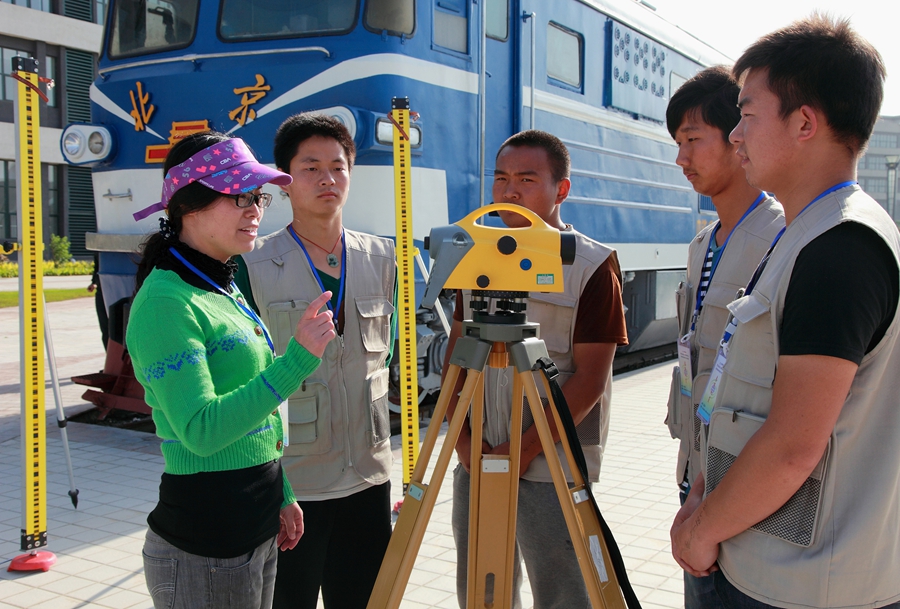 作为学院工程测量技术专业的带头人,张福荣带领她的年轻教师团队近年来在测绘工程教学方面潜心钻研,创新发展,逐步探索出一条特别适合快速提升职业技术院校大学生动手能力的教学新路子。她主导的《高职铁道工程技术专业测量课程教学改革与实践》荣获陕西省高等教育教学成果一等奖;主讲的《线桥隧施工测量》被评为省级精品课程;开发的7门课程被学院评为精品资源共享课。她领导的测绘教学团队被评为省级教学团队;中央财政支持的工程测量技术专业顺利通过国家验收;毕业生综合素质获得用人企业的高度认可,连年供不应求。2012和2013年,她率领学生两次代表陕西省参加全国职业院校技能大赛测绘测量竞赛,连续捧回了四个单项一等奖和一个二等奖、一个三等奖。目前,还负责并参与国家级高速铁道技术、工程测量技术专业教学资源库建设等工作。由于业绩突出,她已先后获得陕西省“五一巾帼标兵”、陕西省教学名师等荣誉称号。并被陕西省教育厅聘为职业院校技能大赛中职组评委、陕西省职业技能鉴定指导中心聘为工程测量工专家。图为张福荣教授正在指导学生测绘实习。(季露)