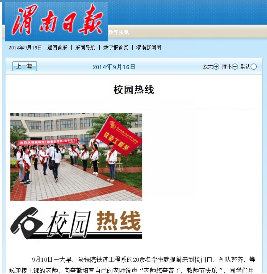 校园热线 9月10日一大早,陕铁院铁道工程系的20余名学生就提前来到校门口,列队整齐,等候迎接上课的老师,向辛勤培育自己的老师说声“老师您辛苦了,教师节快乐”,同学们用简单却又充满深情的方式表达了对老师的敬爱和感激之情,用朴素的行动表达对老师最真挚的祝福。另外,同学们还在校园挂横幅,利用微博、微信、短信、QQ群等媒体向老师们送去真挚的祝福,桂香芬芳的九月校园里处处洋溢着浓浓的师生情谊和节日气氛。 通讯员 毛俊杰 摄影报道