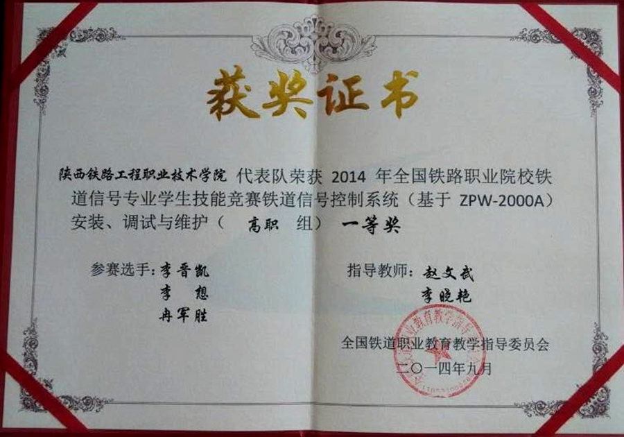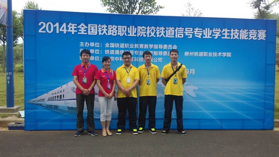 9月24日,2014年首届全国铁路职业院校铁道信号专业技能竞赛——“铁道信号控制系统(基于ZPW-2000A)安装、调试与维护竞赛”在柳州铁道职业技术学院举行。学院铁道通信信号专业的3名学生组成战队,与来自全国16个高职院校的学生同台竞技。面对重重压力,同学们沉着应对,以4小时20分钟的时间,出色完成赛事项目,喜获总成绩第一名,学院也荣获一等奖。