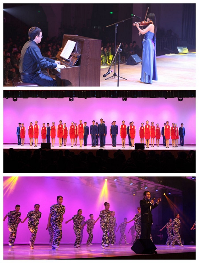 演出在《幸福》的旋律中拉开帷幕,紧接着,动感火辣,活动十足的《爵士啦啦操》以及由渭南火车站职工编排的舞蹈《小苹果》瞬间点燃了观众的热情,喝彩声不断。《礼仪操》、《以青春的名义宣誓》、《映山红》、《祖国不会忘记你》、《口吐莲花》等节目或用优雅的舞姿,或用优美的歌声等,让现场新生眼前一亮,让大家在大饱眼福的同时,对学院丰富多彩的生活产生了新的展望和更多的期待。