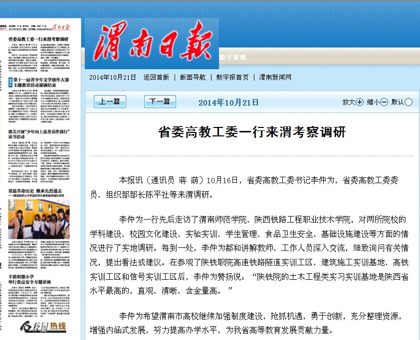 2014年10月21日《渭南日报》题:省委高教工委一行来渭考察调研